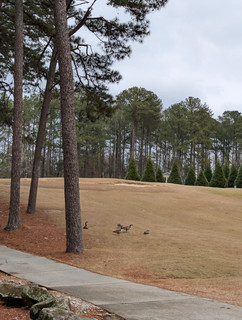 The layout left a lot to be desired. It's a par 70 with just 2 par 5s, but the yardages are still comparable to what you would expect for a par 72: White: ~6100 Blue: ~6400 yards Black: ~6800. That means the yardage lost from the par 5s are made up in the other holes. We played from the blues and 10/12 Par 4s were 400+ yds, and none of the par 3s were shorter than 170. On the par 3s I hit my 7i three times (boring) and my 5i on the other. The only saving grace for the par 3s is that hole 10 is a beautiful hole next to a pond, and hole 16 is the signature par 3 with Stone Mountain in the backdrop, but again, I used my 7i on both.